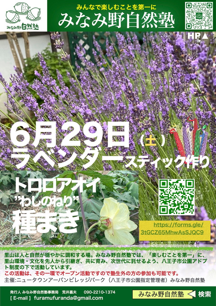 活動のお知らせ2024.06.306月29日 ラベンダーの収穫・ラベンダーステイックづくり ポスト シェア 送る コピーしました リンクをコピー 6月29日(土) 9:30~ ラベンダーの収穫・ラベンダーステイックづくりお申し込み等は、下記のGoogleフォームからお願いします。 読み込んでいます…