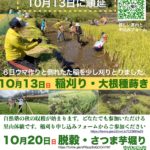 活動のお知らせ2024.10.0510月20日 脱穀&サツマイモ掘り ポスト シェア 送る コピーしました リンクをコピー 10月20日(日) 9:00~ 稲刈りお申し込み等は、下記のGoogleフォームからお願いします。 読み込んでいます…