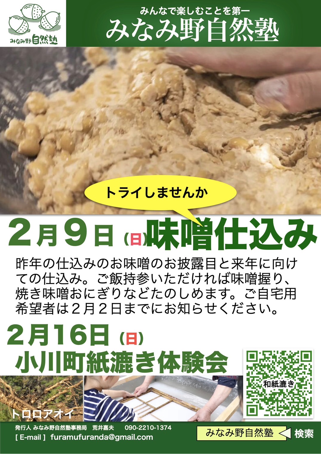 活動のお知らせ2025.04.062月9日 味噌づくり ポスト シェア 送る コピーしました リンクをコピー 2月9日(日) 10:00~ 去年収穫した大豆で味噌を作ります。また、去年作った味噌を味噌汁にして味見します。お申し込み等は、下記のGoogleフォームからお願いします 読み込んでいます…